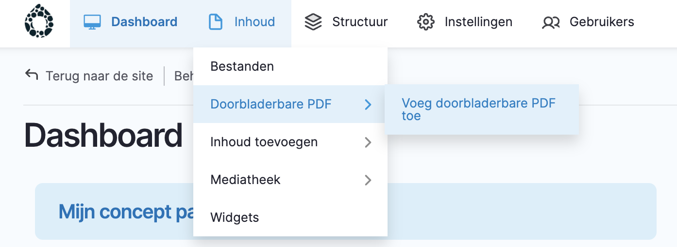 Je kan deze doorbladerbare PDF's ook toevoegen op een pagina van eender wel paginatype via volgende stappen